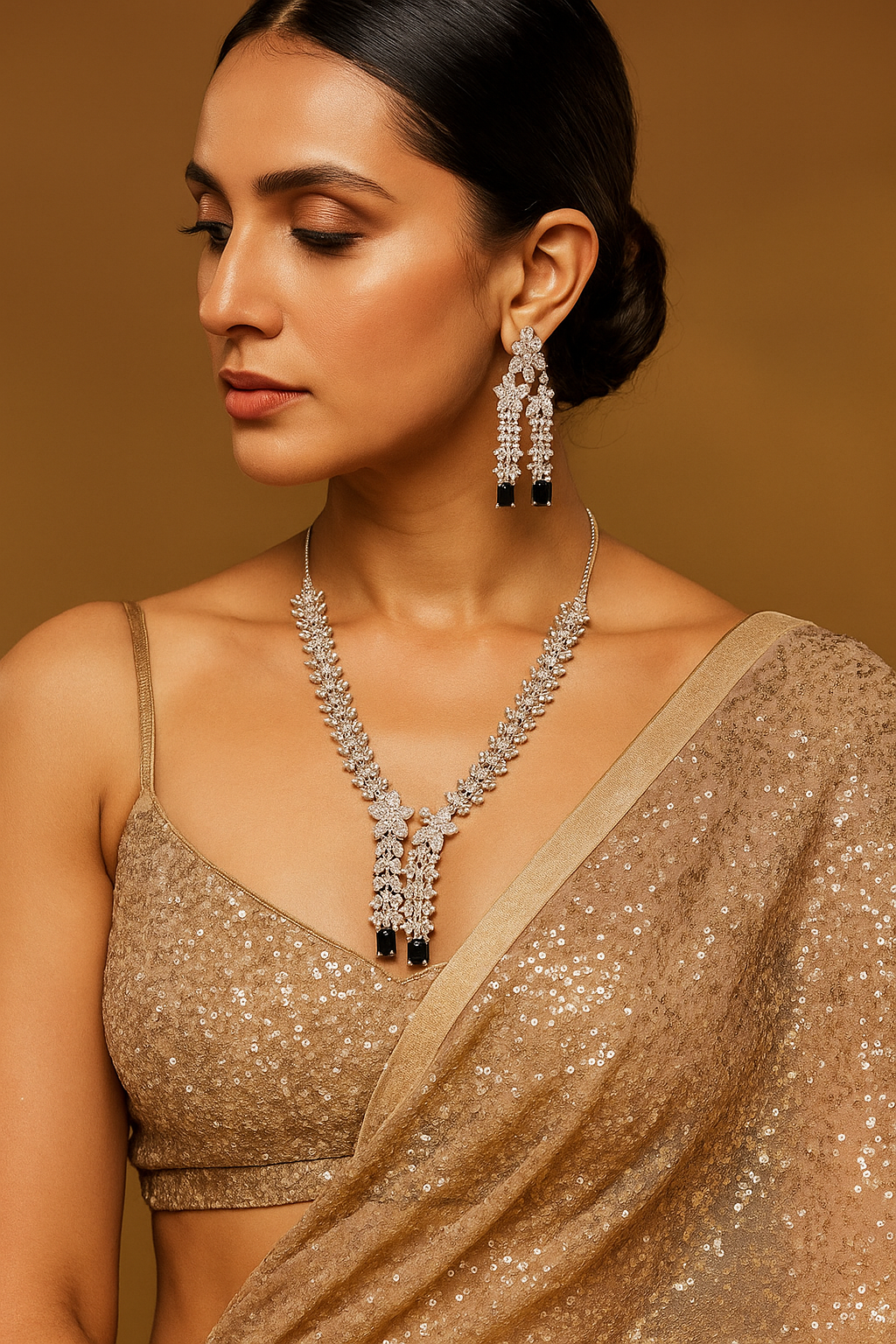 Radiate elegance with this American Diamond Necklace with Maangtika and Earrings, featuring a dazzling necklace, matching earrings, and a stunning maangtika. Designed to add sparkle and grace to any festive or bridal look, this set beautifully blends timeless charm with modern sophistication.