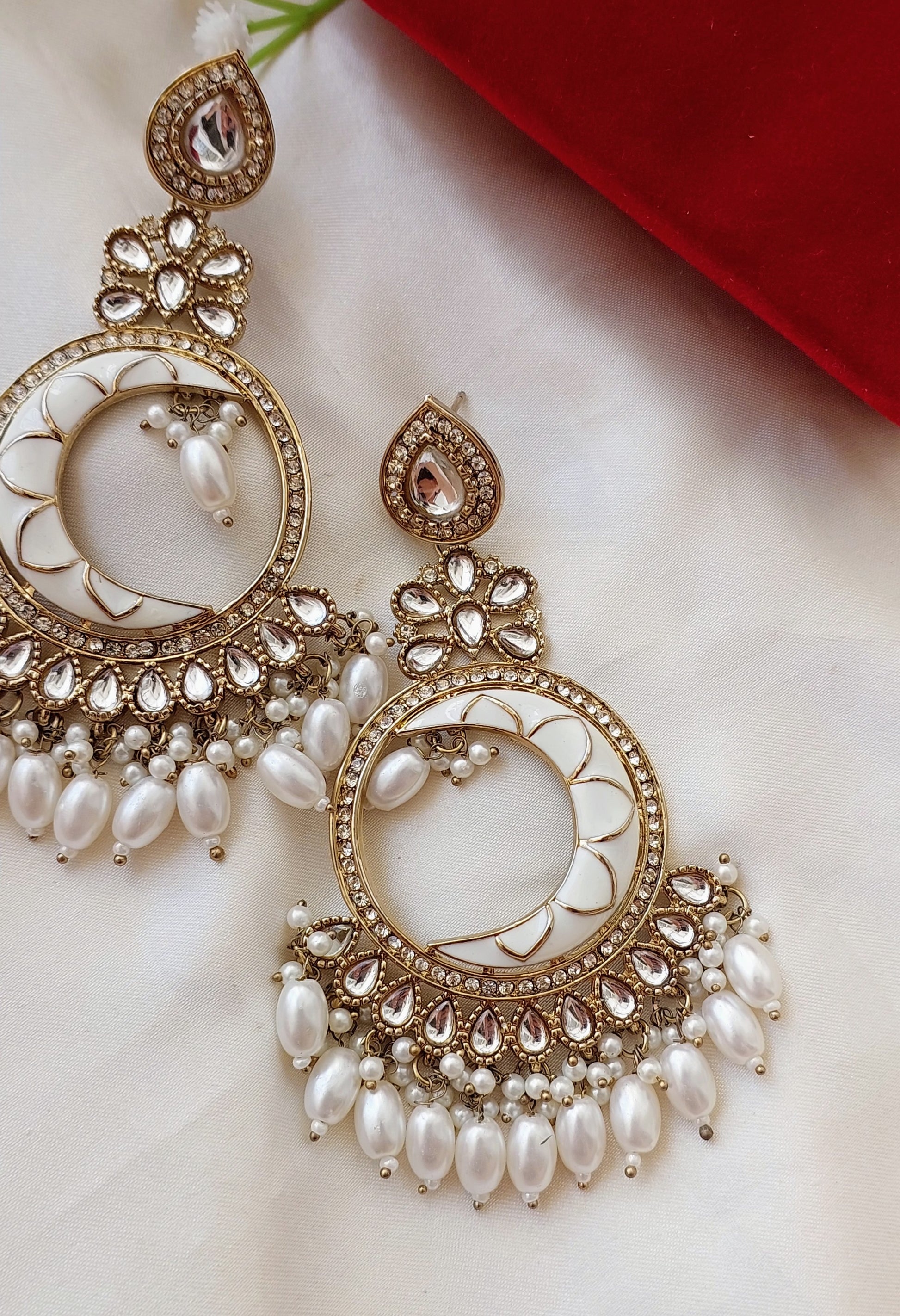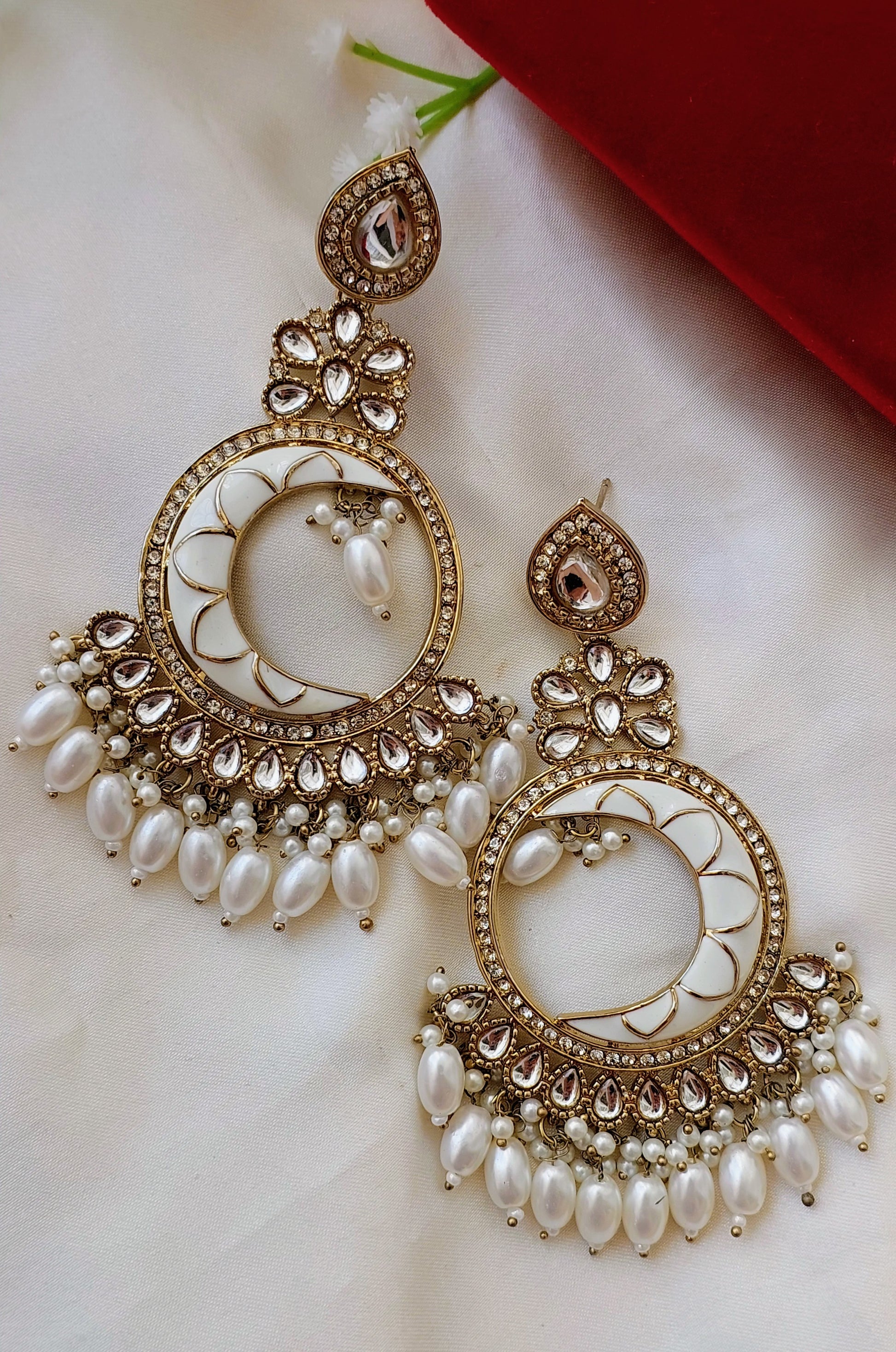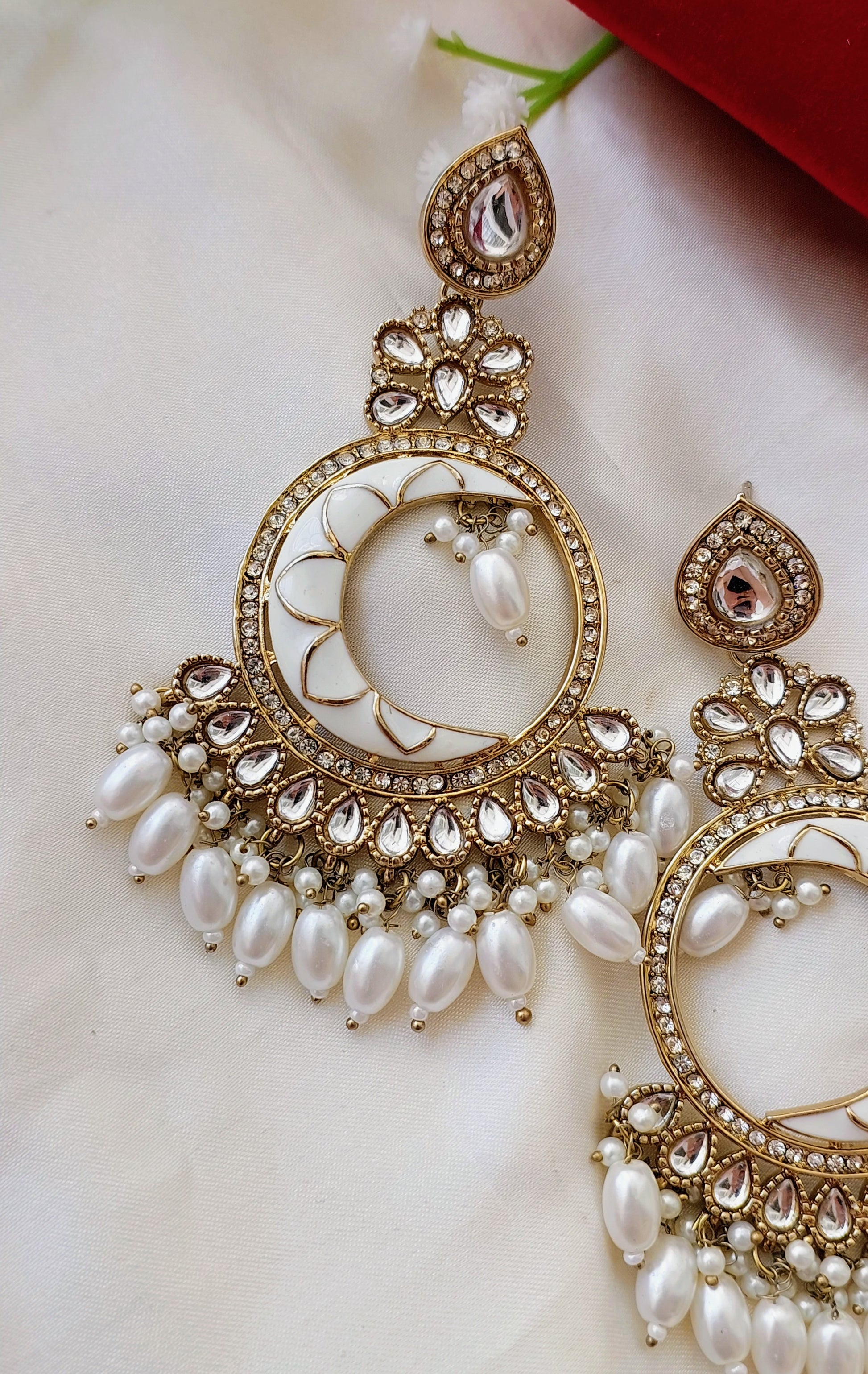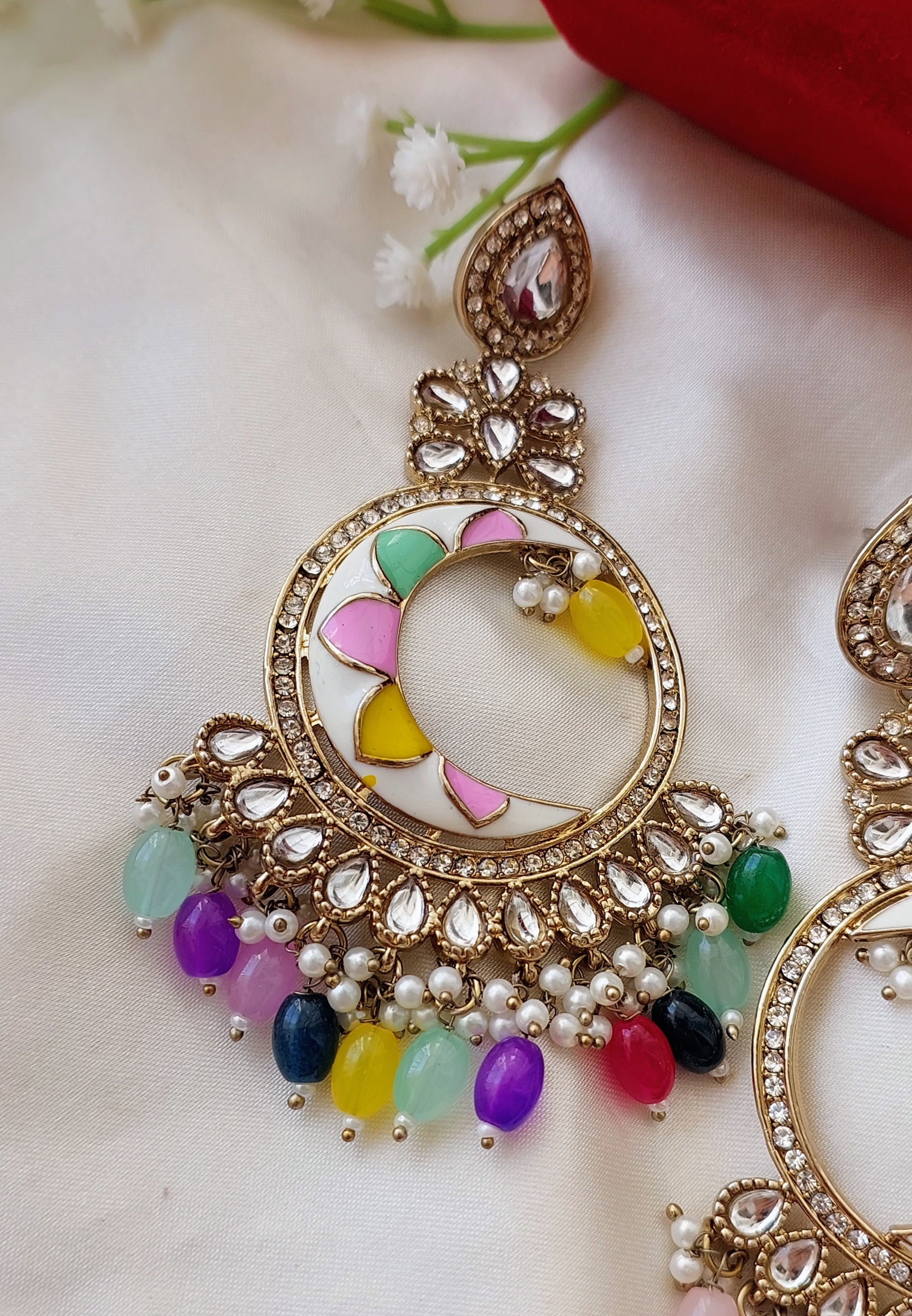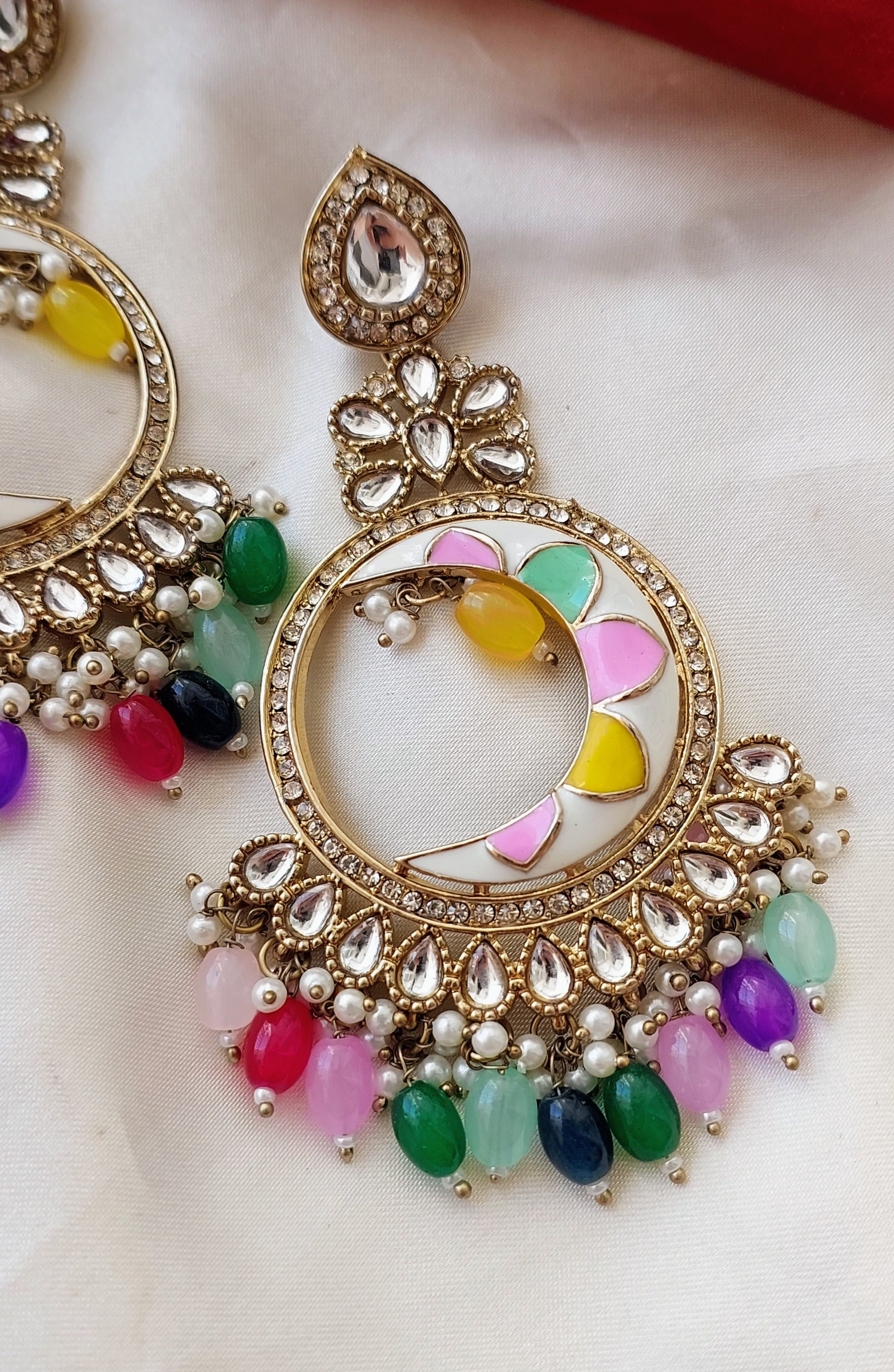 A vibrant pair of chaandbaalis featuring colorful enamel petals, sparkling stones, and pearl drops. These statement earrings bring a perfect blend of tradition and elegance. Ideal for festive occasions and wedding wear.