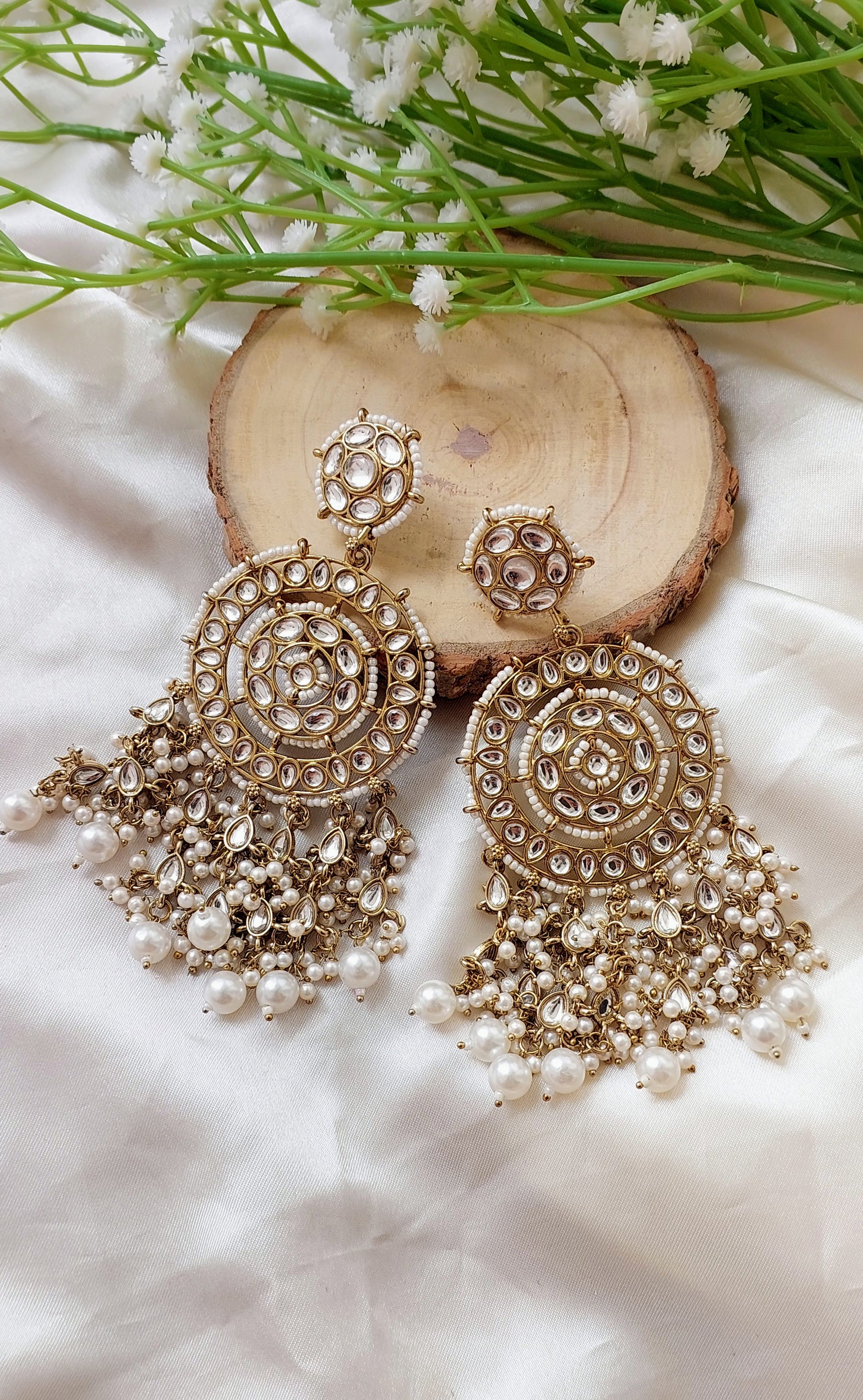 Kashish Chandbali Earrings, crafted with intricate detailing and premium-quality materials. Featuring a royal combination of mirror-finished Kundan stones, delicate hand-beaded pearls, and a graceful gold-toned frame — these earrings are designed to add timeless elegance to any festive or wedding outfit.