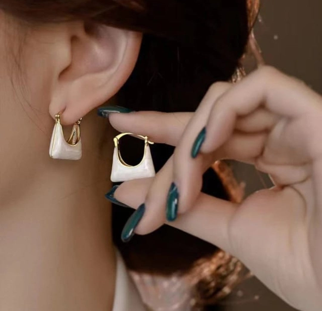 Stylish Kyliee Hoops crafted from stainless steel with an anti-tarnish finish, featuring a unique mini bag-inspired design in glossy pearl white and gold accents. These trendy hoops add a modern and elegant touch to any outfit — perfect for everyday chic or special occasions.