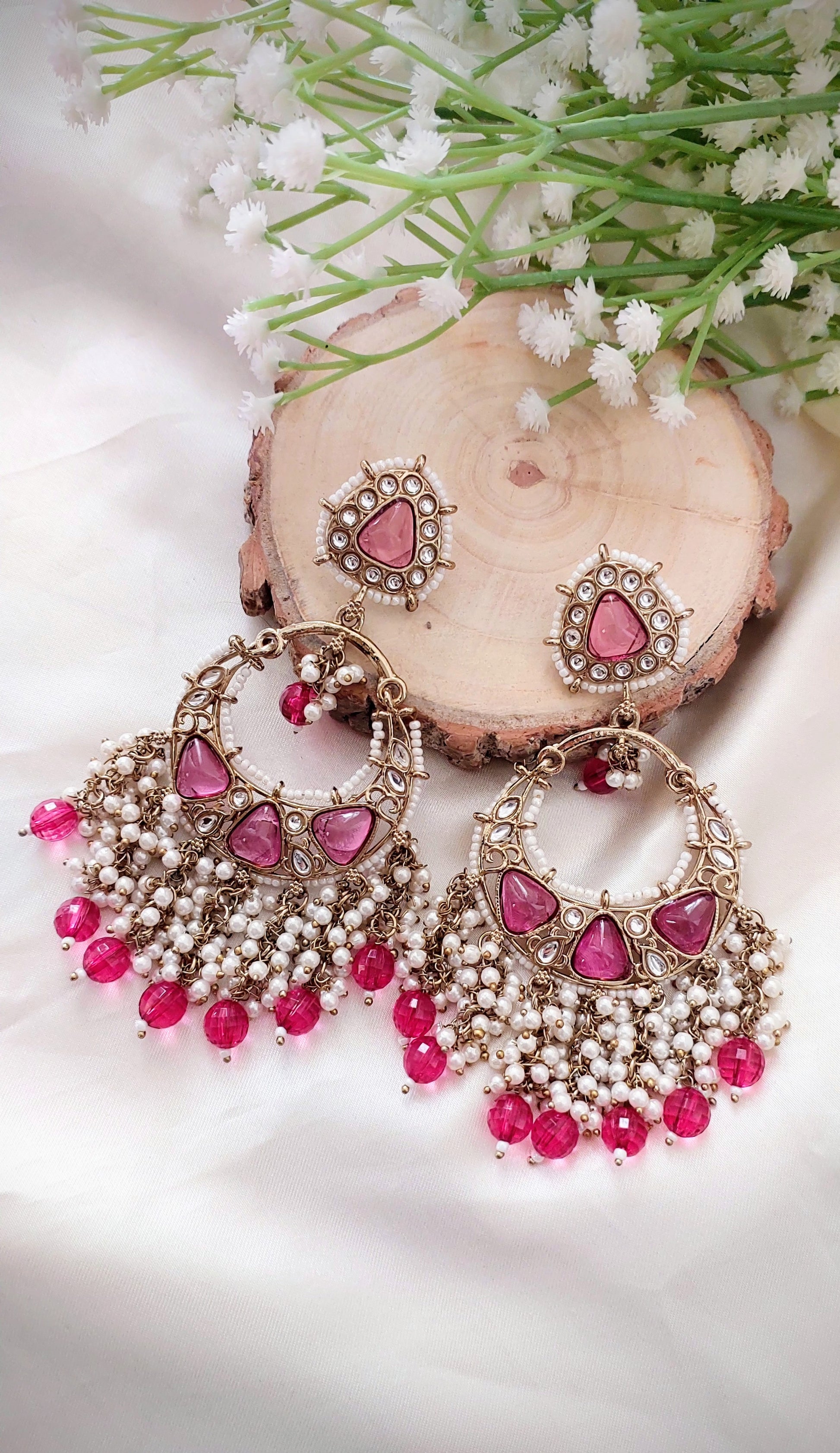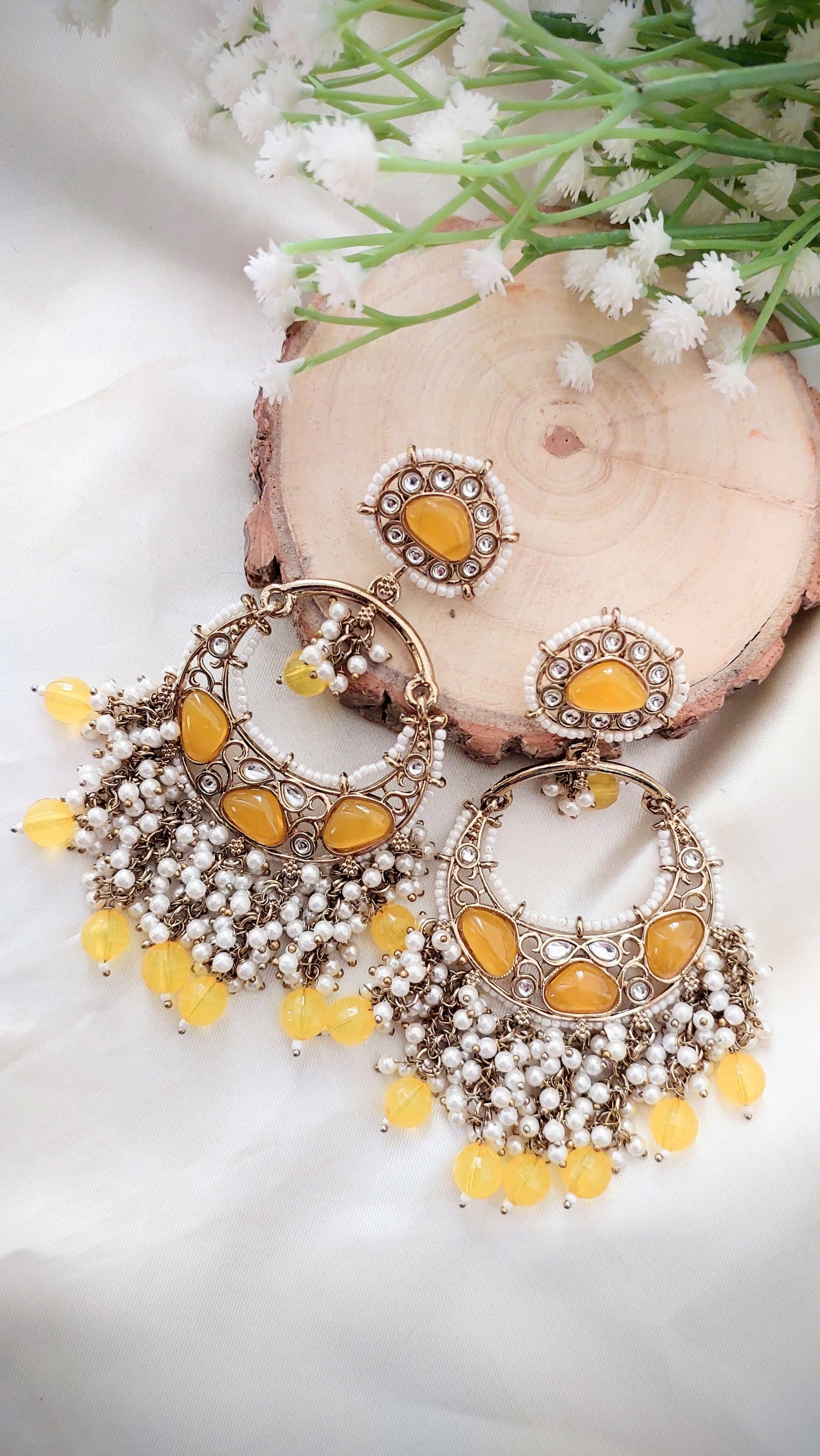 Mehar Chandbali Earrings, crafted with intricate detailing and premium-quality materials. Featuring a royal combination of mirror-finished Kundan stones, delicate hand-beaded pearls, and a graceful gold-toned frame — these earrings are designed to add timeless elegance to any festive or wedding outfit.