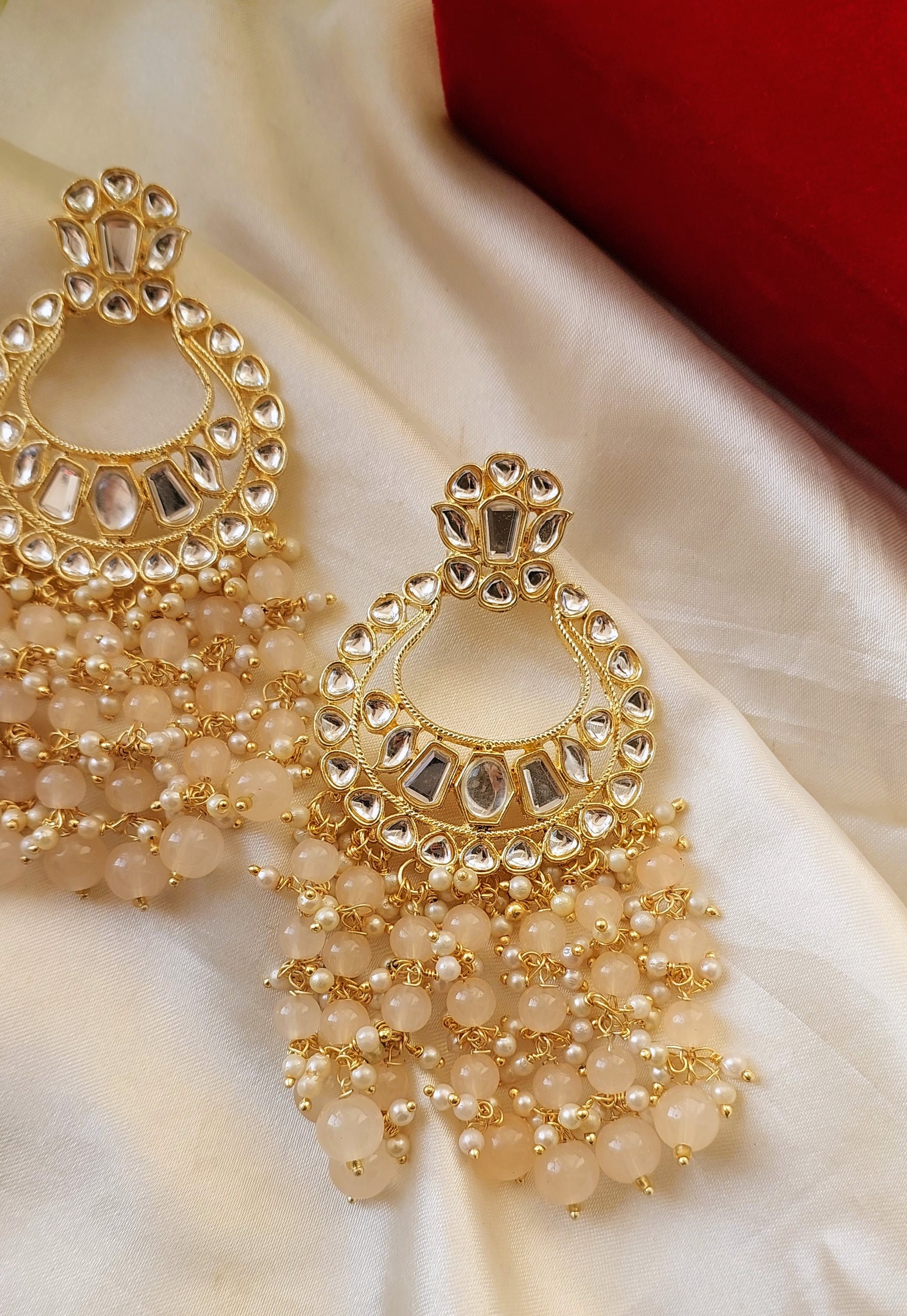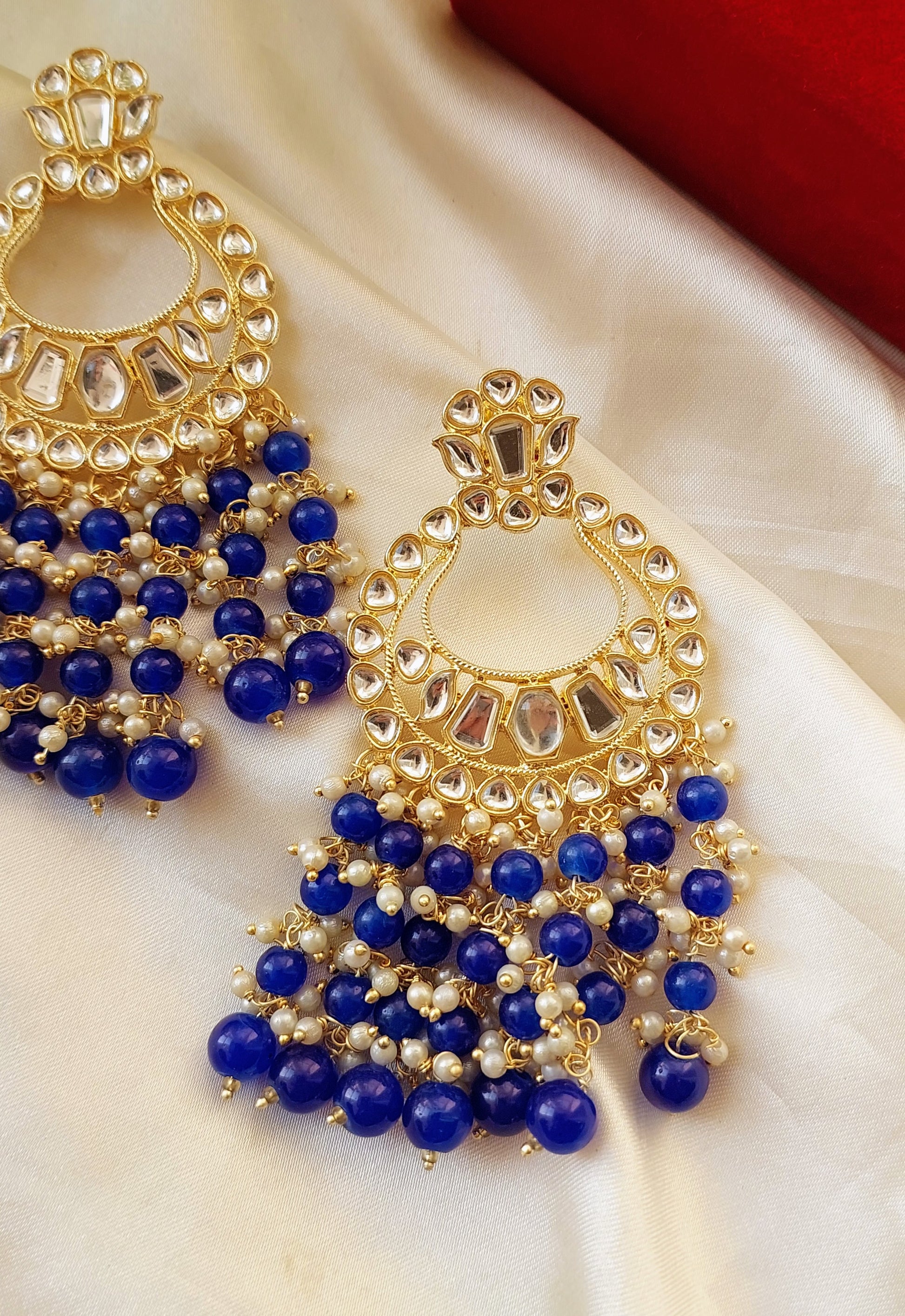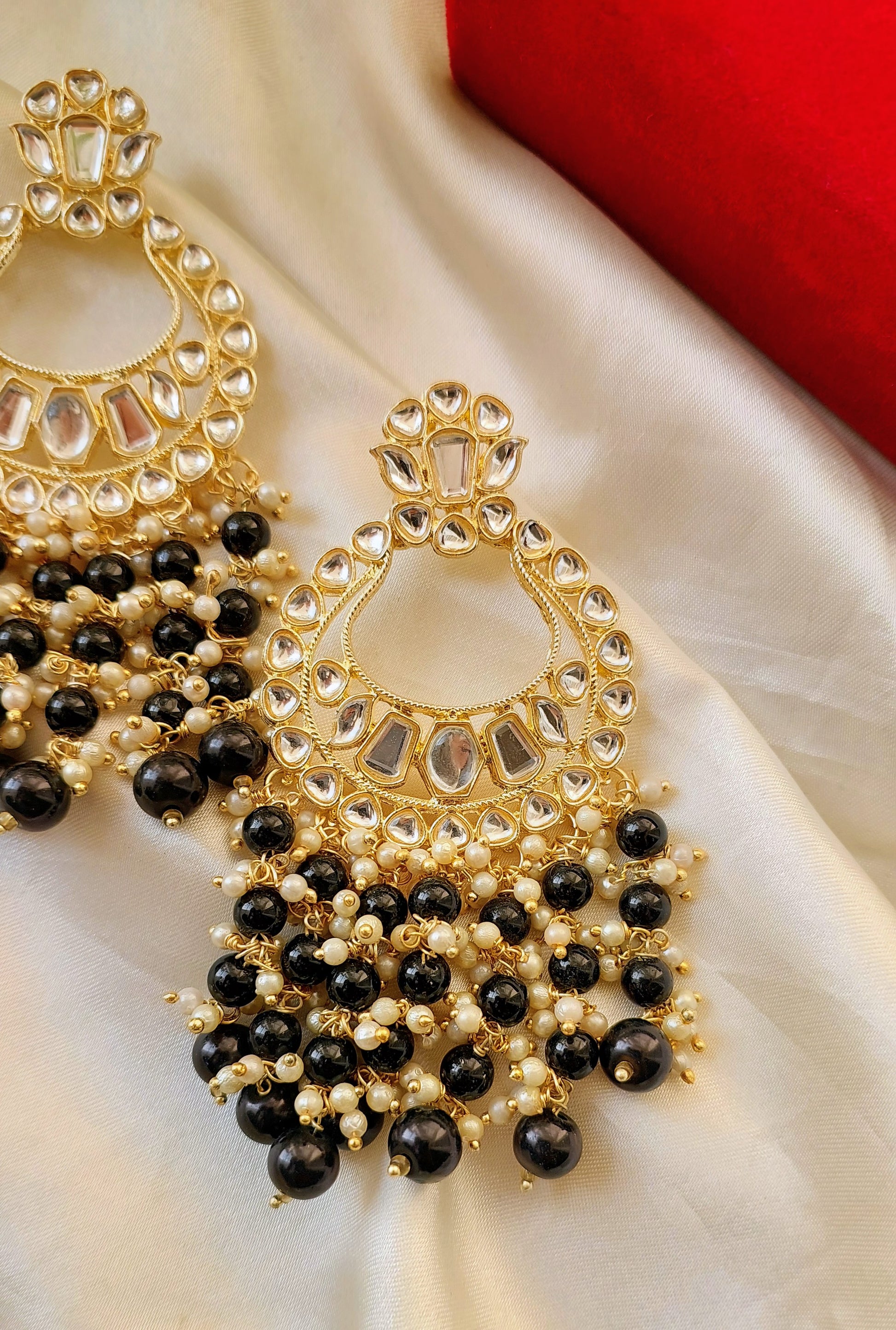Elevate your ethnic look with our Priya Chaandbaali, designed with shimmering kundan stones and elegant black-bead detailing. Perfect for weddings, festivals, and grand celebrations. A statement pair that blends tradition with timeless charm.