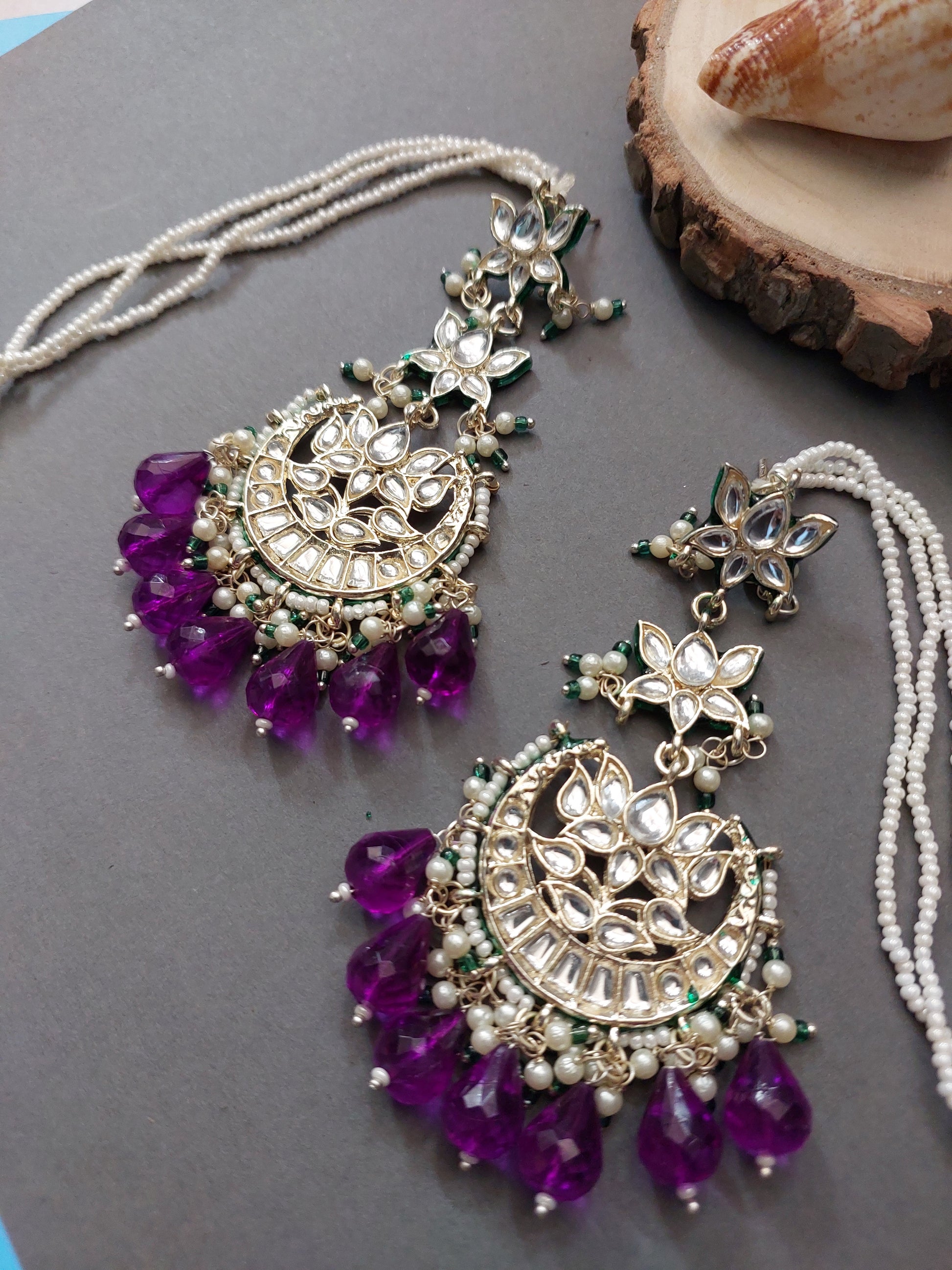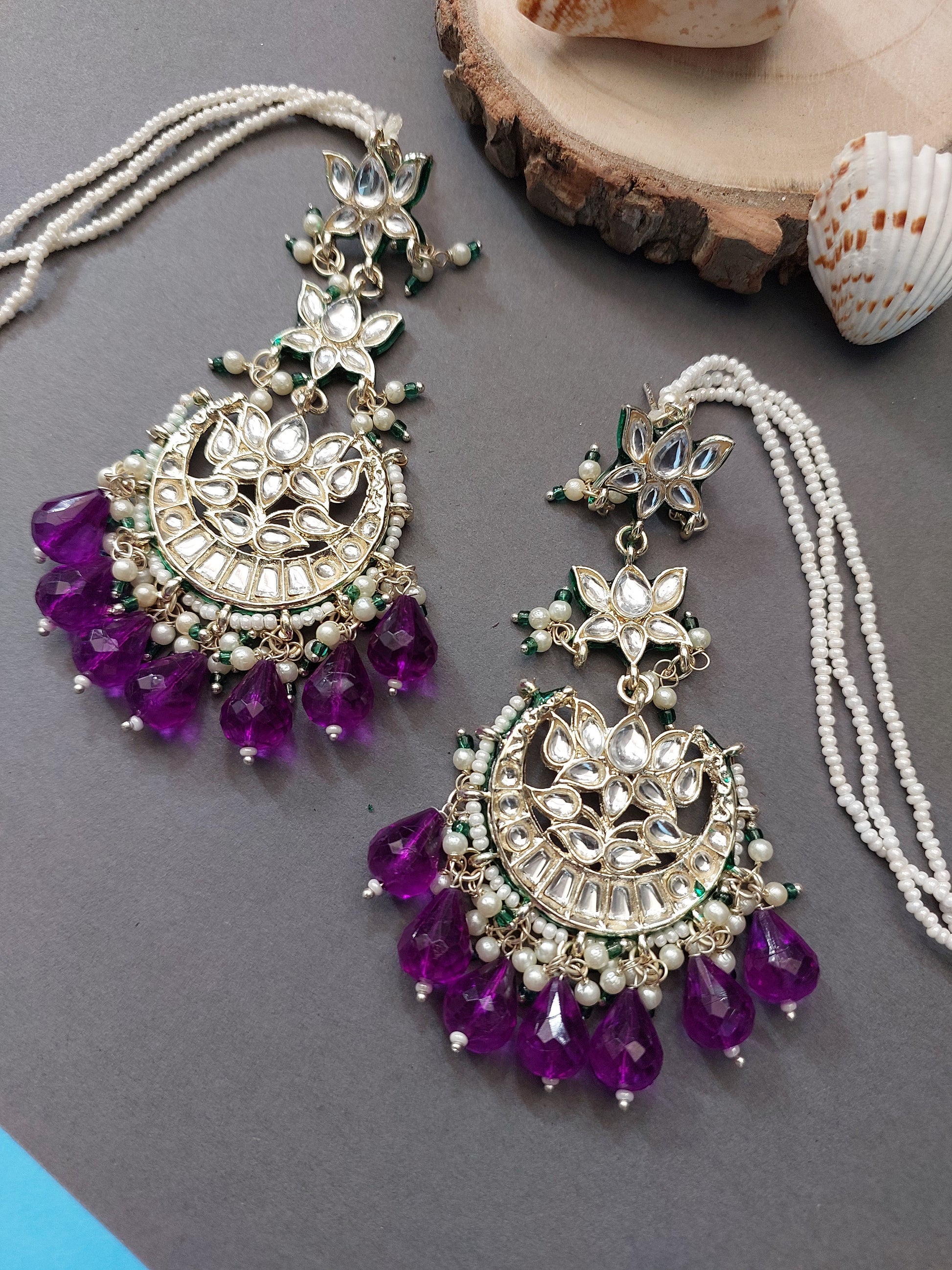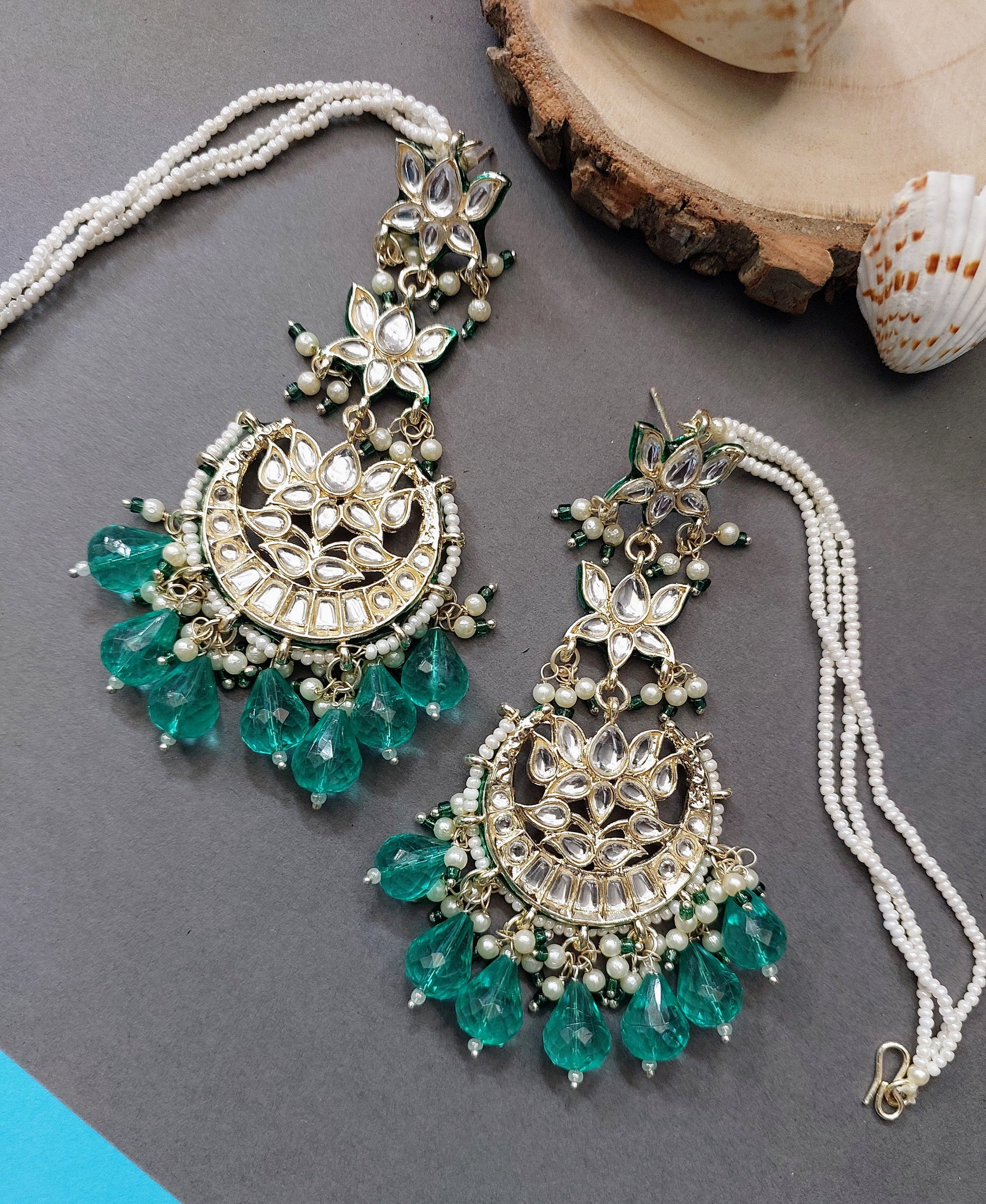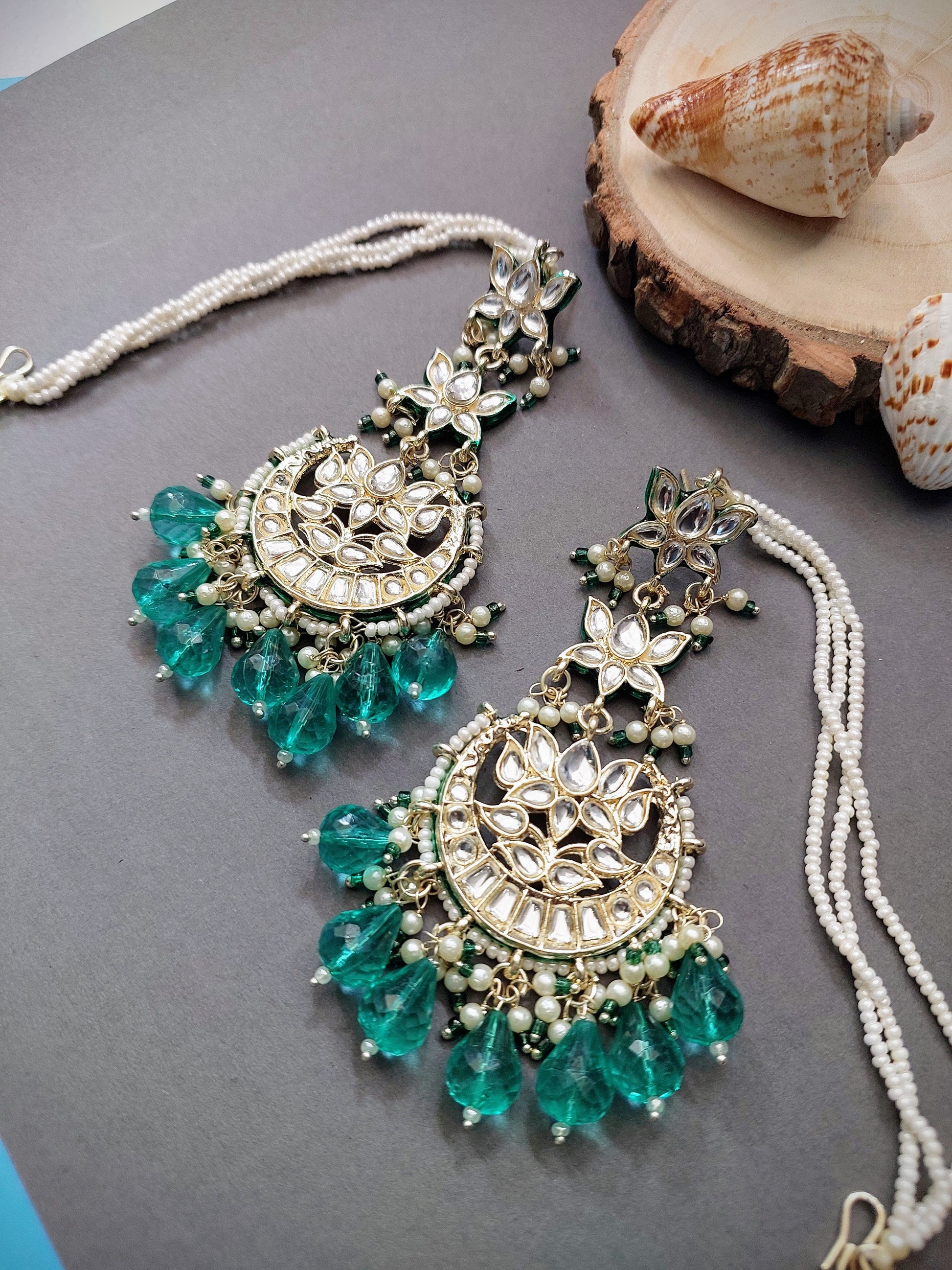 Make a royal statement with our Siddhi Sahara Chaandbaali, adorned with intricate kundan work and elegant green crystal drops. The layered pearl sahara adds a regal touch, making it perfect for festive and wedding occasions.